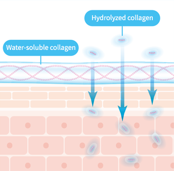 Hydrolyzed collagen can be obtained by hydrolyzing gelatinized collagen. It has a smaller molecular weight than water-soluble collagen and can penetrate the epidermis quickly and moisturize.